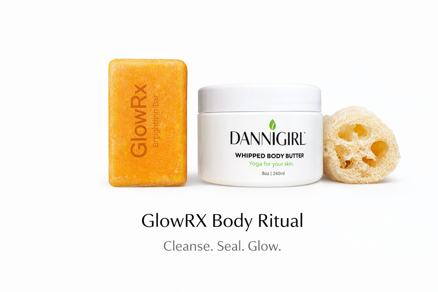 The GlowRX Body Ritual is a simple, nourishing three-step routine designed to support healthy, radiant skin using real skin-food ingredients. The GlowRX Brightening Bar gently cleanses and refreshes the skin, while the natural loofah exfoliates and supports circulation for smoother texture. Fiinish the process with our luxury Whipped Body Butter, which deeply nourishes and seals in moisture, leaving skin soft, balanced, and glowing. Formulated to work with your skin—not against it.